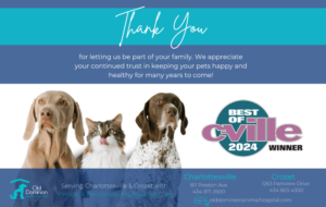 We want to extend our heartfelt thanks to each and every one of you for nominating and voting us Charlottesville’s Best Veterinary Hospital in Best of C-ville for the third year in a row. We are deeply grateful for your support and the community’s recognition. Reflecting on the past 42 years, we are incredibly thankful. We began humbly as a one-doctor practice with Dr. Chuck Wood in 1982, and have since grown to an eight-doctor, two location practice. This achievement is a testament to your trust and support. Thank you for being a part of the Old Dominion Animal Hospital family.