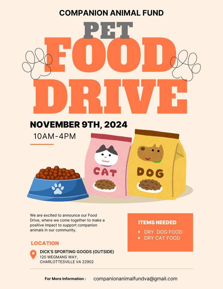 The food collected from today’s drive will help the Companion Animal Fund partner with community partners like Meals on Wheels of Charlottesville/Albemarle, Loaves and Fishes and many others.